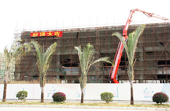 2010年11月29日上午十時三十八分,伴隨著震耳的爆竹聲,巨臂泵車將最后一車砼漿澆注在2#標(biāo)準(zhǔn)廠房樓頂,標(biāo)志著2#、3# 4.7萬平米標(biāo)準(zhǔn)廠房全面如期封頂,為重大項目入駐奠定了基礎(chǔ)。