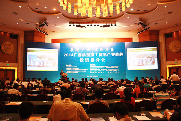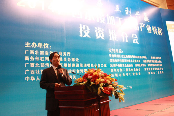 2014年7月16日,由自治區(qū)商務(wù)廳主辦的2014廣西承接加工貿(mào)易產(chǎn)業(yè)轉(zhuǎn)移投資推介會在深圳舉行。自治區(qū)政府副秘書長魏然,深圳市經(jīng)濟(jì)貿(mào)易和信息化委員會副主任高林等領(lǐng)導(dǎo)和嘉賓為會議致辭。自治區(qū)商務(wù)廳、北部灣辦分別從不同角度對廣西承接加工貿(mào)易產(chǎn)業(yè)轉(zhuǎn)移投資環(huán)境進(jìn)行了推介。北海、欽州、梧州、南寧四個國家級加工貿(mào)易梯度轉(zhuǎn)移重點承接地,欽州保稅港區(qū)、憑祥綜合保稅區(qū)、北海出口加工區(qū)、中馬欽州產(chǎn)業(yè)園、東興國家重點開發(fā)開放試驗區(qū)、南寧高新技術(shù)產(chǎn)業(yè)開發(fā)區(qū)、中國電子北海產(chǎn)業(yè)園、梧州市粵桂合作特別實驗區(qū)八個重點園區(qū),分別就各自的產(chǎn)業(yè)布局、投資環(huán)境、政策優(yōu)勢進(jìn)行了推介。香港特區(qū)政府駐粵辦、香港貿(mào)易發(fā)展局、深圳外商投資企業(yè)協(xié)會、深圳臺商協(xié)會、深圳市加工貿(mào)易企業(yè)協(xié)會、深圳市企業(yè)聯(lián)合會、深圳市電子行業(yè)協(xié)會及廣東各類加工貿(mào)易企業(yè)約400人出席了推介會。